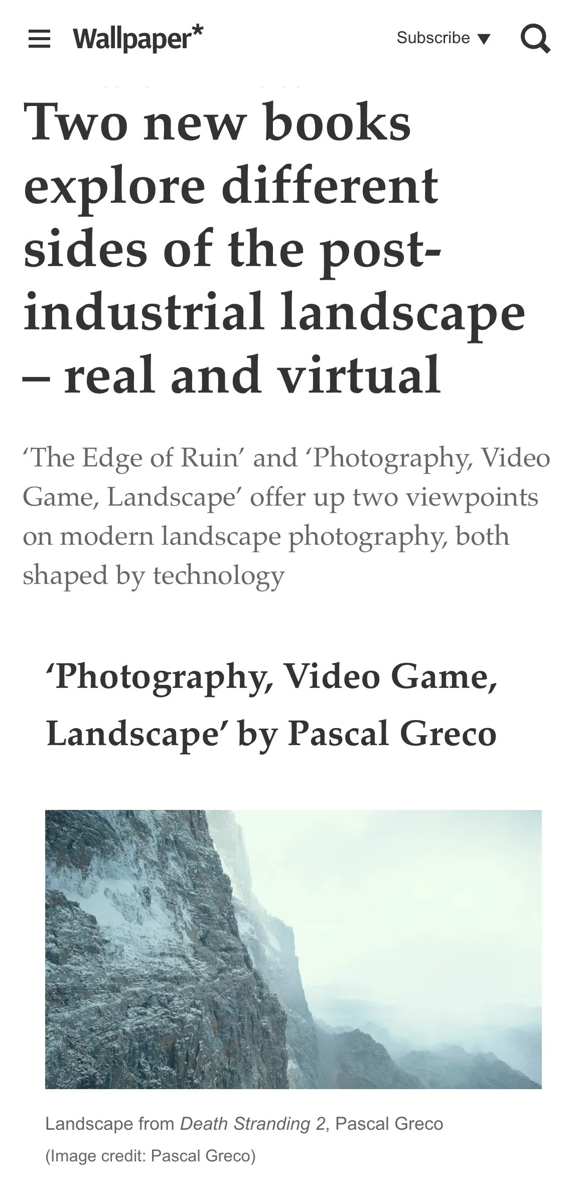 Article about my new book PHOTOGRAPHY, VIDEO GAME, LANDSCAPE in Wallpaper. Full article here.